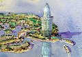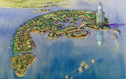The resort is connected to the mainland by a tunnel and includes a pier for mega-yachts of up to 80m in length as well as an inner cove providing moorage for smaller vessels. Fine dining restaurants and high-end retail outlets will be dispersed throughout the site. The Lotus Resort has been planned for ecological balance and environmental sustainability.